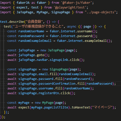もしplaywrightでランダムなユーザーで会員登録テストをしたい場合は次のようになります。